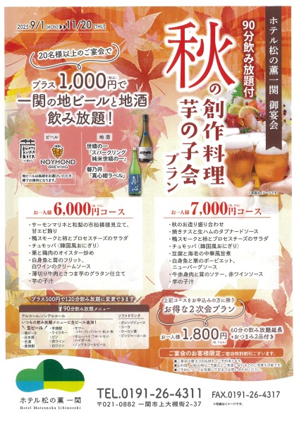 生ビール付!秋の創作料理~芋の子会秋の宴会プラン~