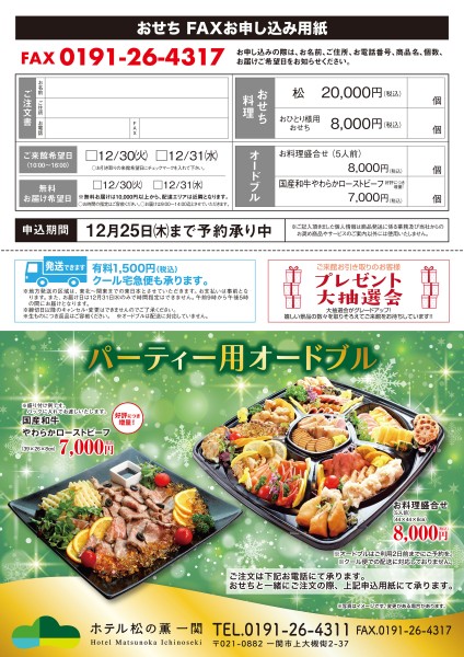 お知らせ 2025.11.05 令和8年 おせち承ります!! 今年も残りわずかとなりました!ホテル松の薫一関より松の薫特製おせちのお届けを、、、2、3名様用「松」とおひとり様用どちらも限定100個となります!!ご予約をお待ちしております。パーティー用オードブルとローストビーフも承っております! 戻る